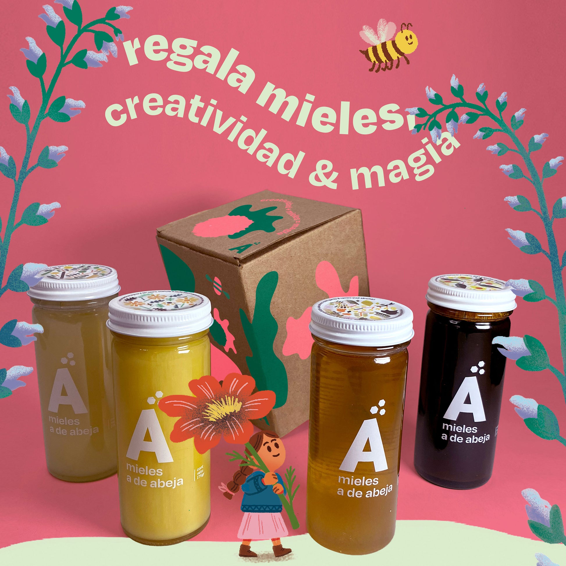 Este kit incluye 4 mieles de 175g, notas de cata - maridaje, caja y tarjeta de regalo.